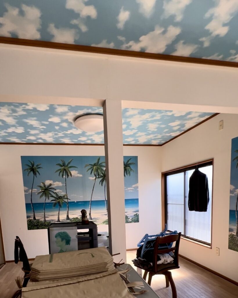 まぁ絵柄の善し悪しは置いておいたとしても、天井と壁が青いと照明をつけても室内が暗いんですよね。とても。